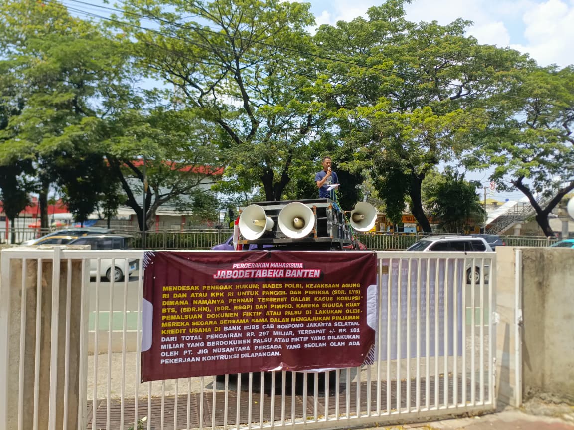 Puluhan massa yang tergabung dalam Pergerakan Mahasiswa Jabodetabeka Banten (PMJB) itu menggelar unjuk rasa untuk mendesak agar PT JIG Nusantara Persada, yang merupakan salah satu Perusahaan Cangkang alias perusahaan bentukan Moratelindo Grup dalam melancarkan aksi-aksi Money Laundry dan Mafia Perbankan selama ini, agar segera diusut tuntas sampai ke akar-akarnya.