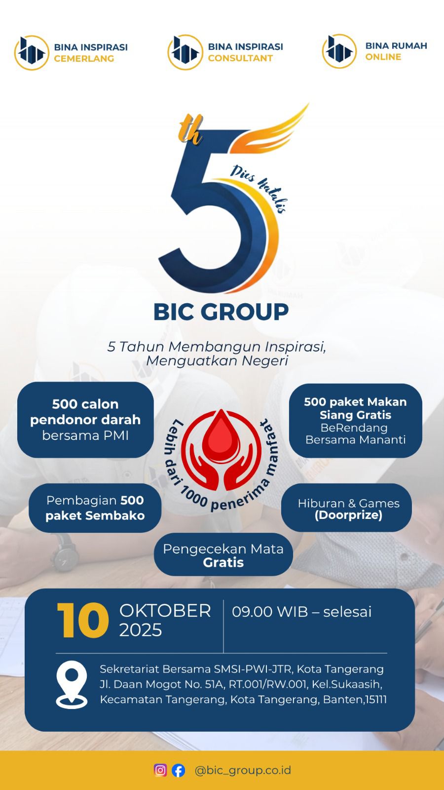 Merdekanusantara.com , Kota Tangerang – Merayakan ke -5 Tahun Bina Inspirasi Cemerlang (BIC) Group yang akan menyelenggarakan di Sekretariat Bersama (Sekber ) PWI , SMSI Kota Tangerang dan JTR dengan tema “Membangun Inspirasi, Menguatkan Negeri” hari Jum’at 10 Oktober 2025 menggelar bermacam kegiatan sosial, Donor darah bersama PMI (500 calon pendonor),Pembagian paket sembako sebanyah 500,paket makan siang gratis BeRendang 500 bersama Mananti, Pengecekan mata gratis dan Hiburan sekaligus ada Doorprize nya.