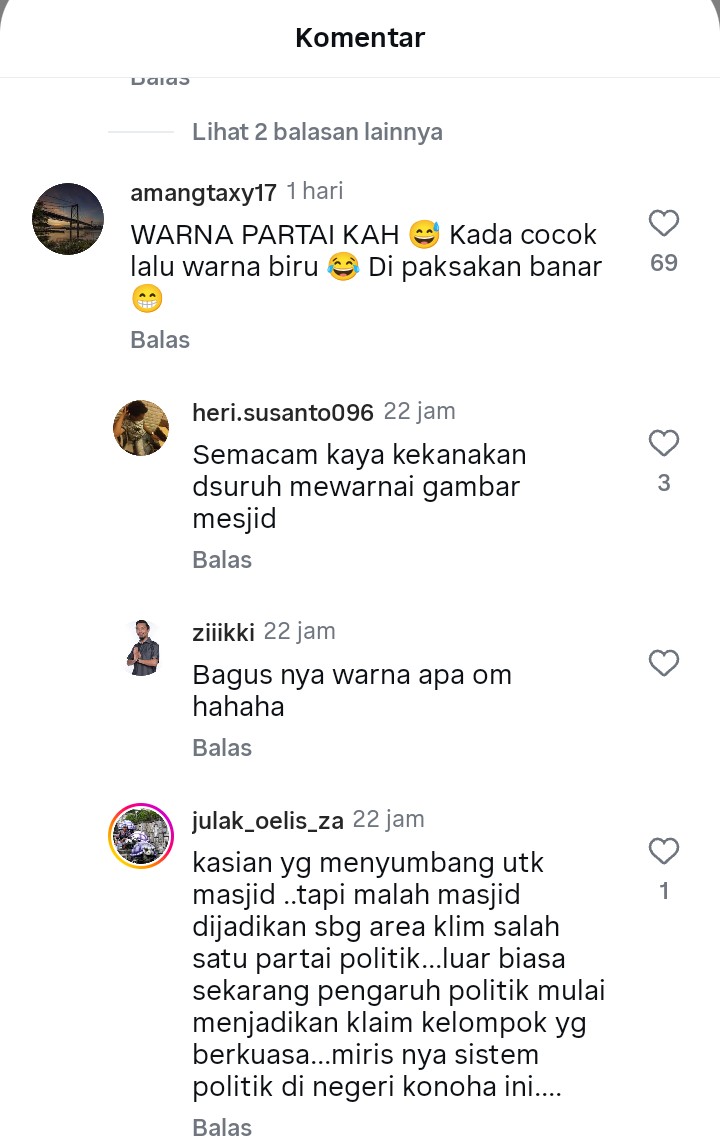“Warna partai kah kada cocok lalu warna biru.Dipaksakan banar,”tulis pemilik akun @amangtaxy17.